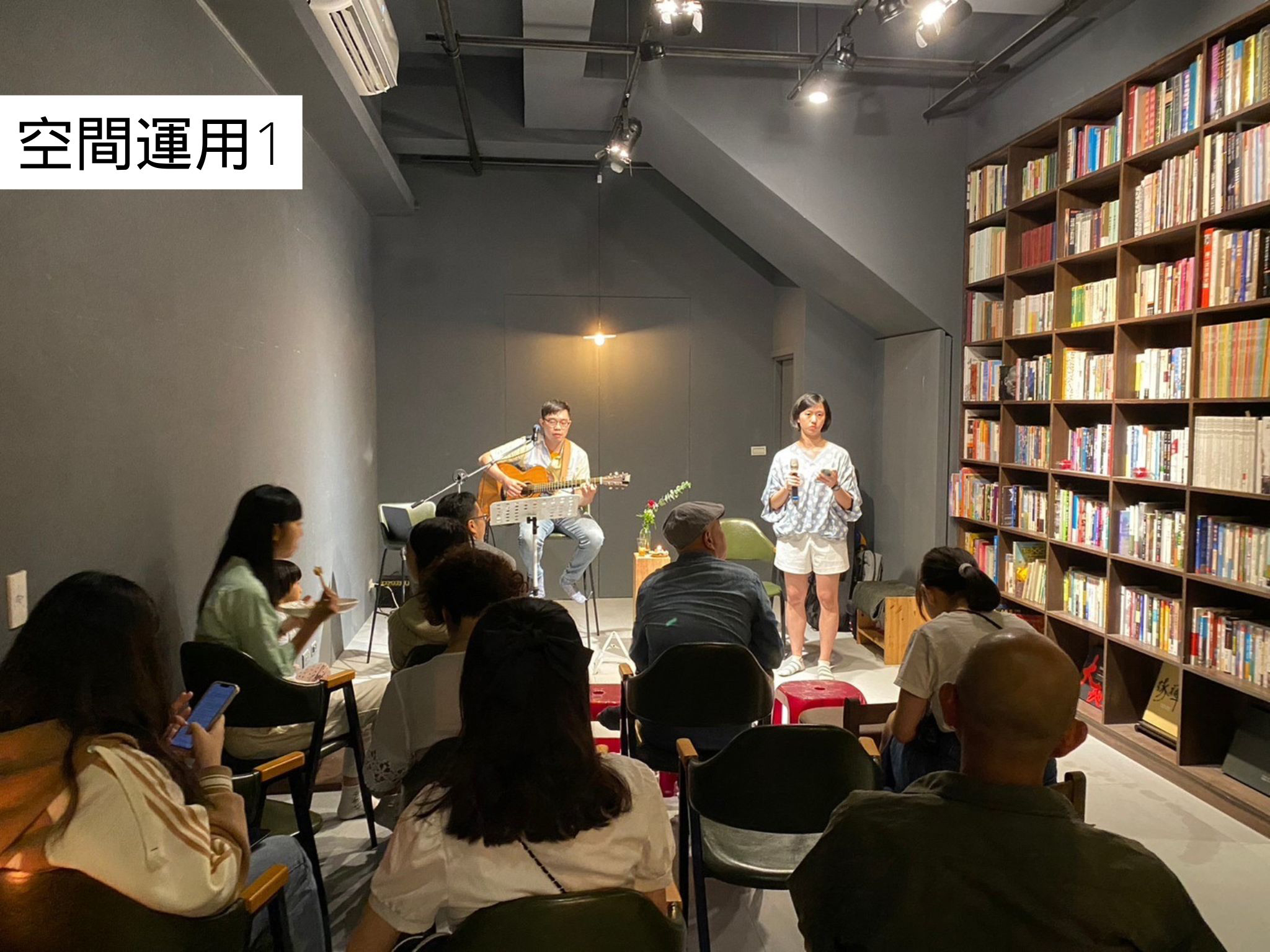 基本日光照明、鏡牆、木地板、冷氣、冷熱飲水機、手握麥克風、無線網路Wifi、延長線、電風扇、藍芽音響(無CD播放)、皮椅14張、高腳椅5張、方桌7張、矮木椅2張、塑膠椅(矮)10張、塑膠椅(中)4張、塑膠椅(高)9張、長桌1張
